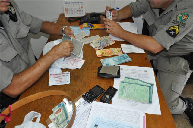 Com a dupla os policiais encontraram três galões de óleo lubrificante, adquiridos da primeira vítima, R$ 1.150,00 em dinheiro e oito folhas de cheques, sendo uma preenchida no valor de R$ 808,00 dada ao posto de combustível, quatro preenchidas e três somente assinadas. Os suspeitos estavam em um VW Santana, placas: KDF-0295, de Senador Canedo.